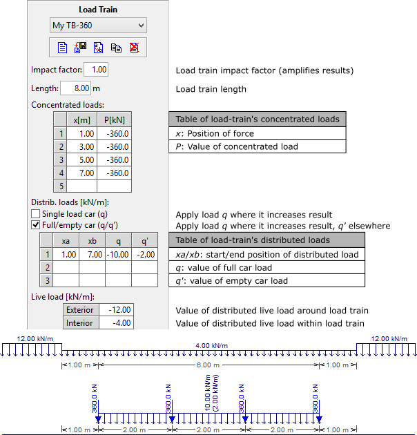 Load-train concentrated forces are specified using a matrix with two columns, with the following parameters:
